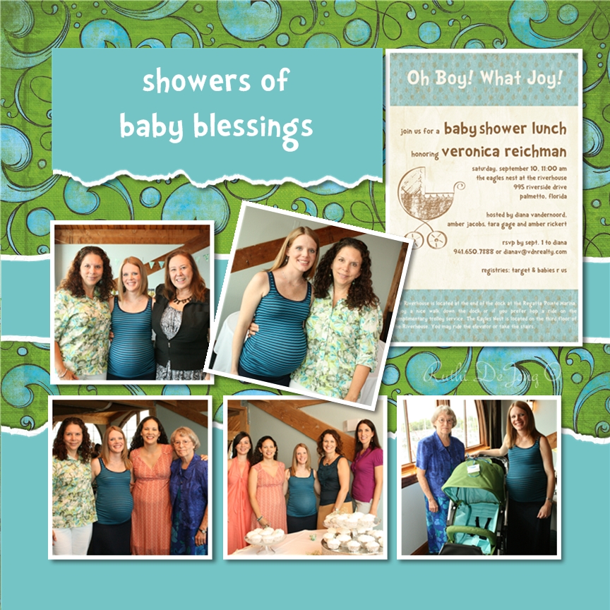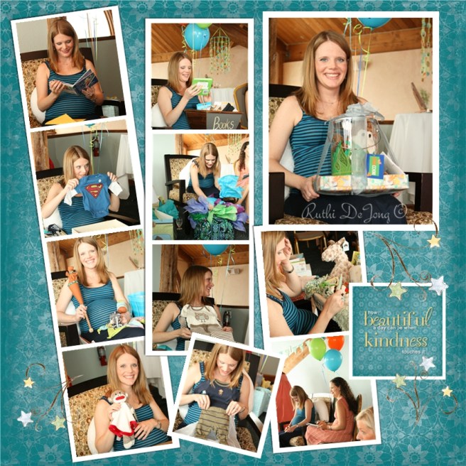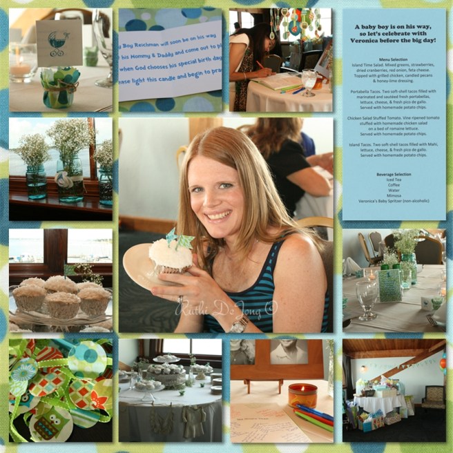 As promised here are some photos of Veronica’s baby shower. Finding time to continue my 15+ year tradition of creating scrapbooks AND blogging photos is a time challenge. So I decided to combine them by sharing some of my pages here (minus the journaling). Unfortunately this means smaller photos for you to view but I hope you can still enjoy them and get a feel for the day.