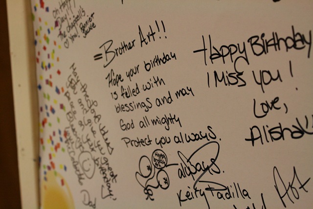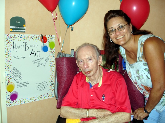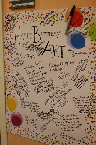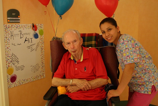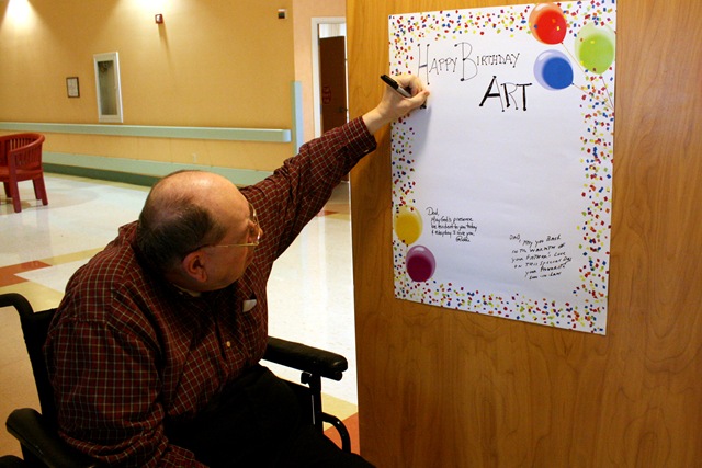I put up a happy birthday poster outside of Dad’s door, with the idea of having friends and family write a little note when they came by for a visit. I was surprised when I came back the next day and found it filled up… mostly with notes from his caregivers. I hope you can read some of them. They touched my heart.